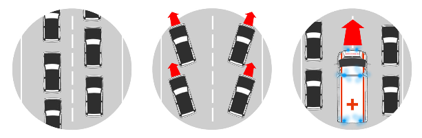 Auf einer zweispurigen Straße wird die Rettungsgasse in der Mitte gebildet, d. h. die Autos auf der linken Spur fahren nach links, die auf der rechten Spur nach rechts.Auf einer Straße mit mehr als zwei Fahrspuren wird die Rettungsgasse zwischen der äußersten linken Spur und der Spur rechts daneben gebildet. Die Begründung für diese Lösung besteht darin, dass sich auf den rechten Fahrspuren mehr LKW befinden und so mehr Restbreite für die Einsatzfahrzeuge verbleibt.